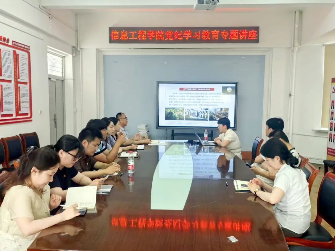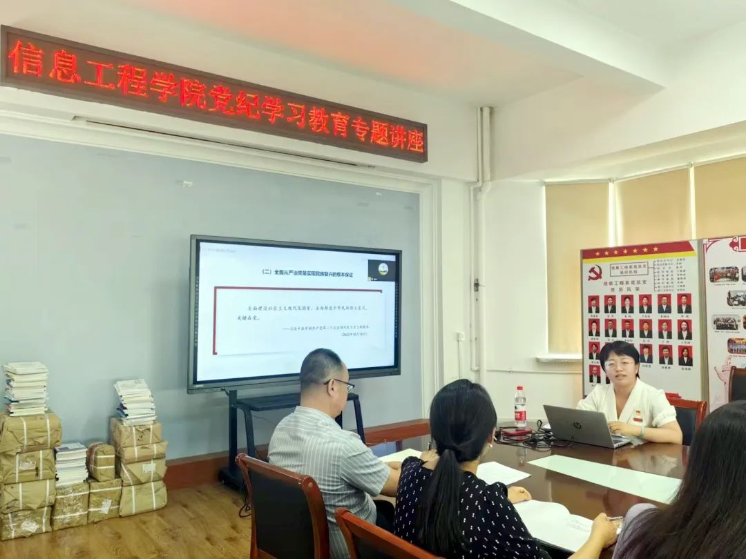 为深入开展党纪学习教育,强化师生党员“学纪、知纪、明纪、守纪”的行动自觉,6月20日,信息工程公司党总支邀请公司党纪学习教育宣讲团成员、马克思主义公司副经理刘慧颖在主楼401开展党纪学习教育专题讲座。信息工程公司党总支教师党员及2021级员工党员参加讲座。讲座由党总支书记李树旺主持。